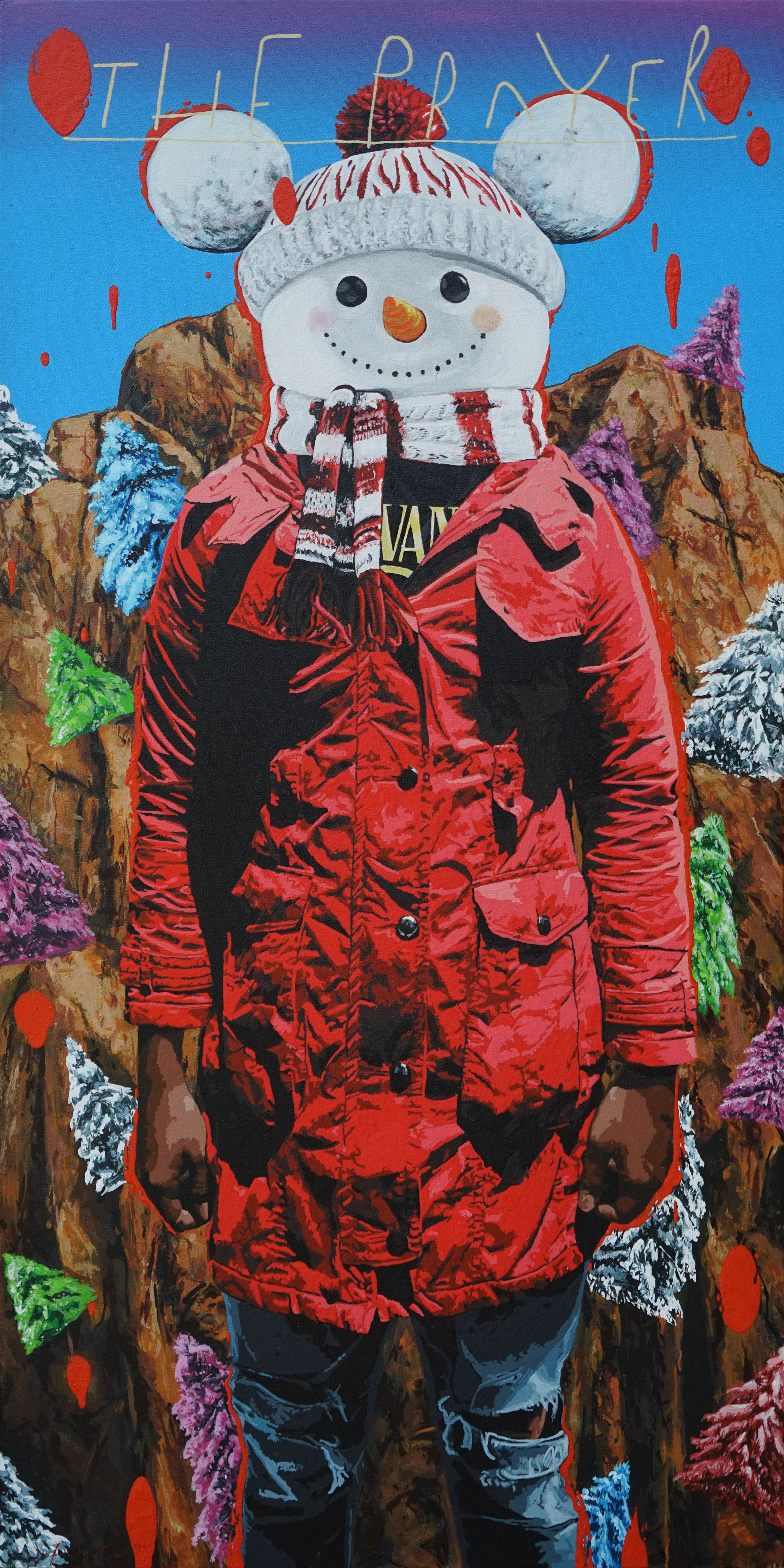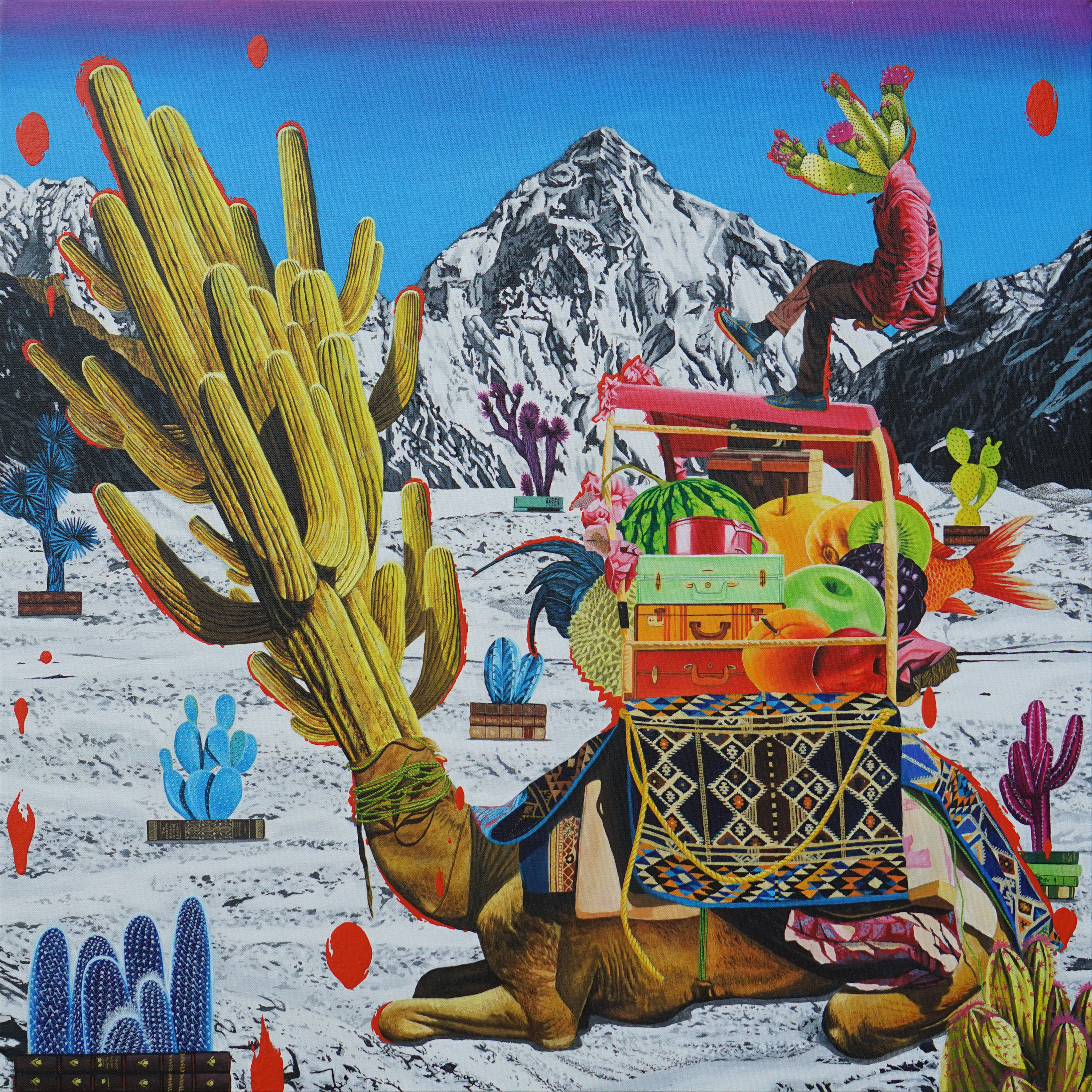 The painting titled Cultural Invasion (2024): An exhausted camel, kneeling in a snowy desert, behind it are mountains also covered in snow. The camel back holds a tower of things, there are fruits, chicken, fish, and even at its head and muzzle is a tall cactus tree. This is how Jafin describes cultural invasion, although the word invasion is now done in a gentle manner, subtle, but the impacts are significant. New traditions (of culture) arrive from all corners of the world, effectively penetrate through the latest technology (smart phone and all its features), has a seductive force that is anesthetizing, repetitive, and addiction inducing. This painting seems to be related to the artworks Tumbuh dan Kembang #1 and Tumbuh dan Kembang #2 (2024): when a cactus tree can thrive in a snowy plane, that it grows colorful blooms, it can be well-assumed that it has acclimatized well. Acclimatization could be understood as acculturation, cultural crossovers, and the likes. Likewise, when an evergreen tree grows in an arid land with solid rocks, yet it can bear colorful flowers, even under snow, it can be well-assumed that it is forced or force itself with adaptation. This is how invasion could be understood, whether it is internalized and forced, coerced, or compelled.