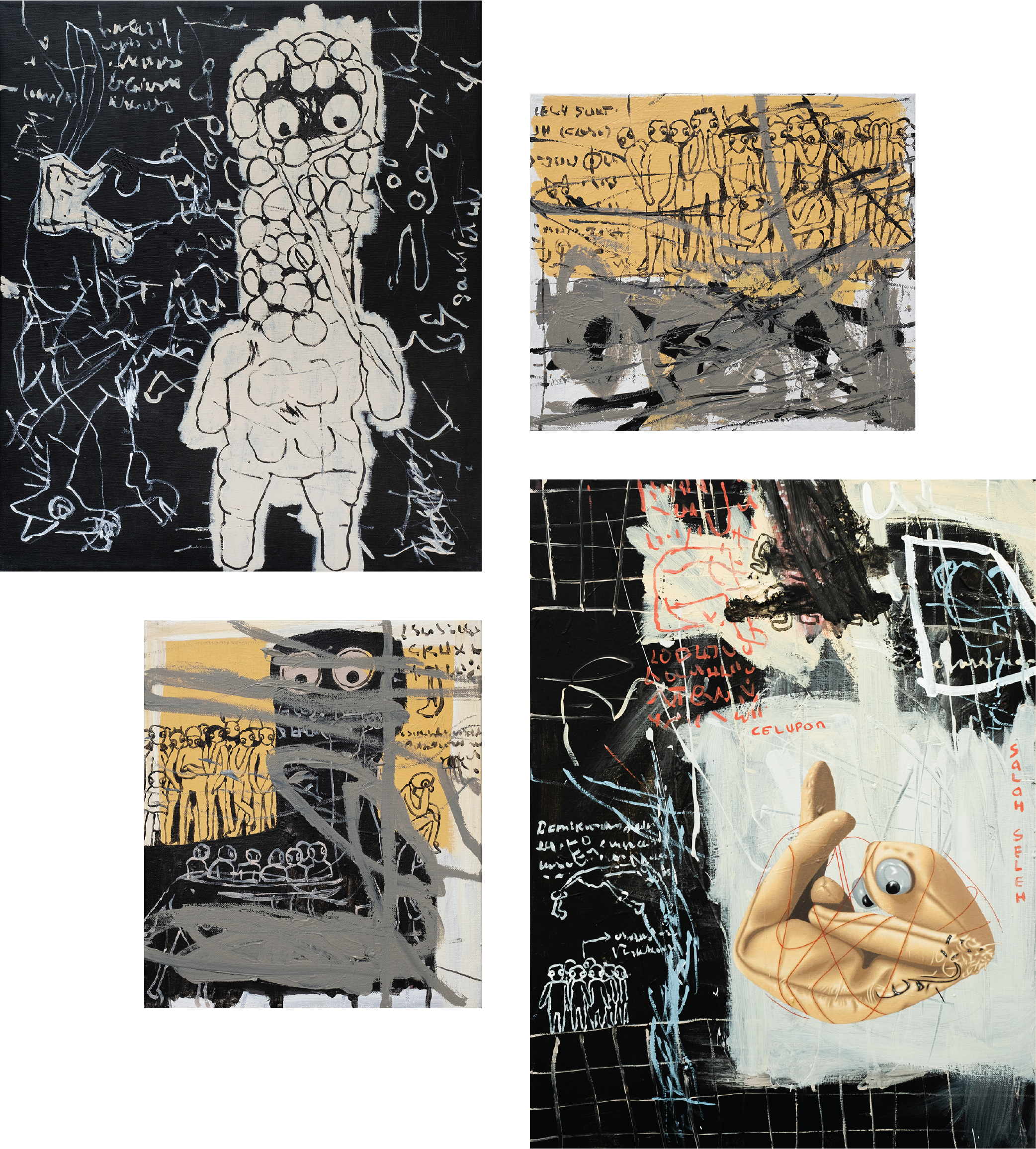 For every doll in his paintings, Samsul always makes the ‘models’ by hand. Usually, they are mini-sized and adorned with accessories like masks, scarves, pencils, or backpacks. Some ride horses or camels. This doesn't mean he can't paint the dolls directly without the models. For Samsul, making dolls by hand is part of his personal expression. He photographs the dolls to create a kind of scenography for his paintings. For some past exhibitions, he has also enlarged the dolls into lifesized sculptures.