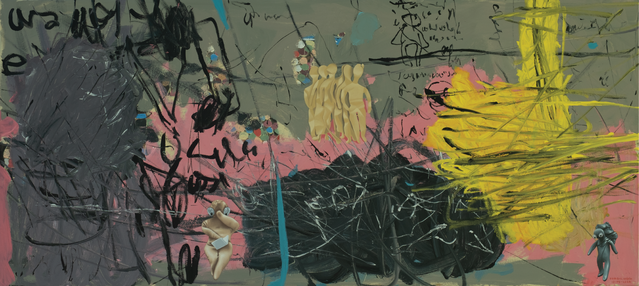Samsul’s fabric dolls, depicted realistically, may evoke empathy and admiration for his artistic skill. Meanwhile, the tumultuous scribbles, defying the rules of form or line, reflect inner chaos or an uncontrollable world. When juxtaposed together, these two elements present a tension between stability and unrest. The dolls become entangled in a larger visual struggle—a world filled with harsh strokes, perhaps a symbol of mental turmoil, confusion, or even an inability to find wholeness.