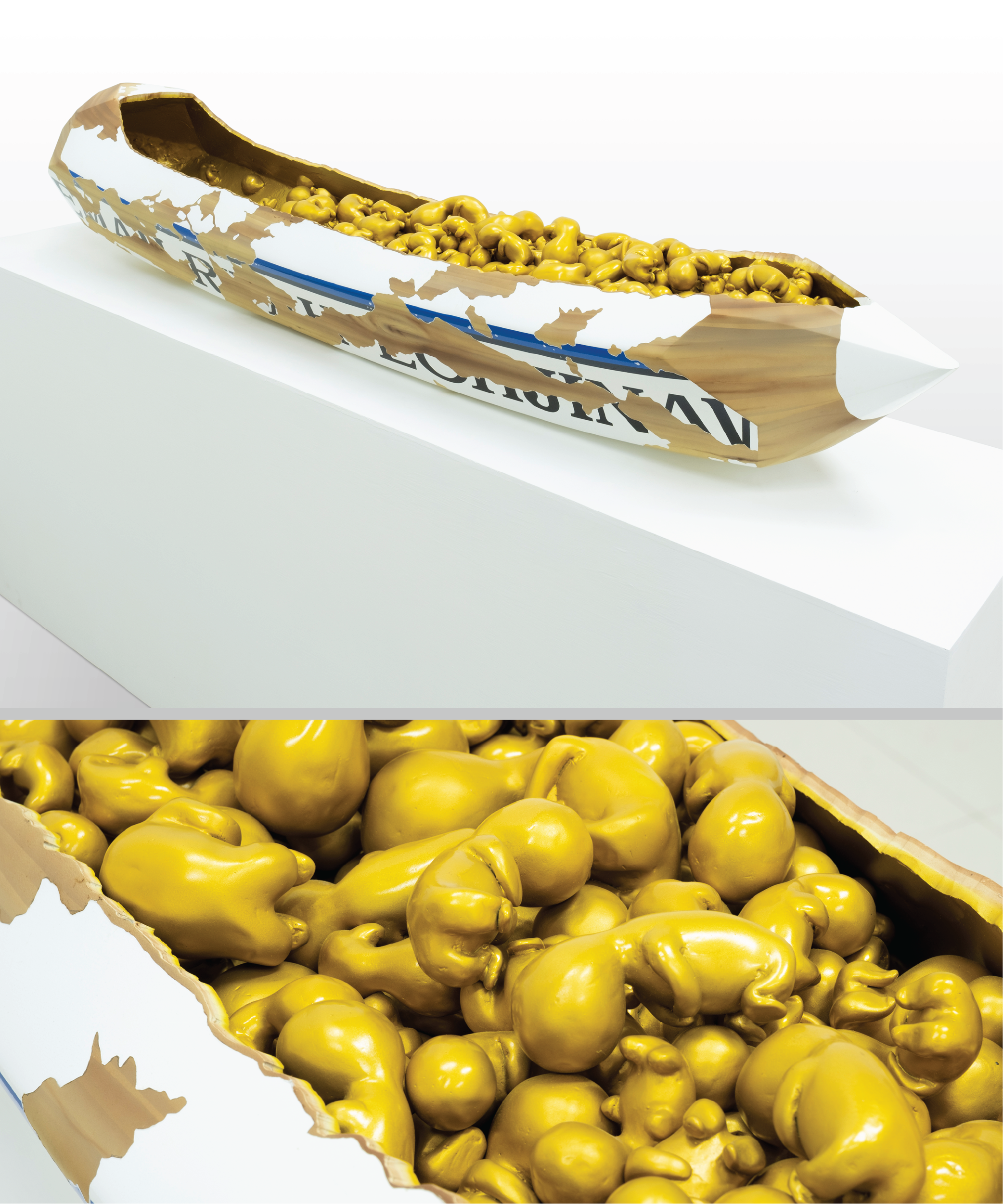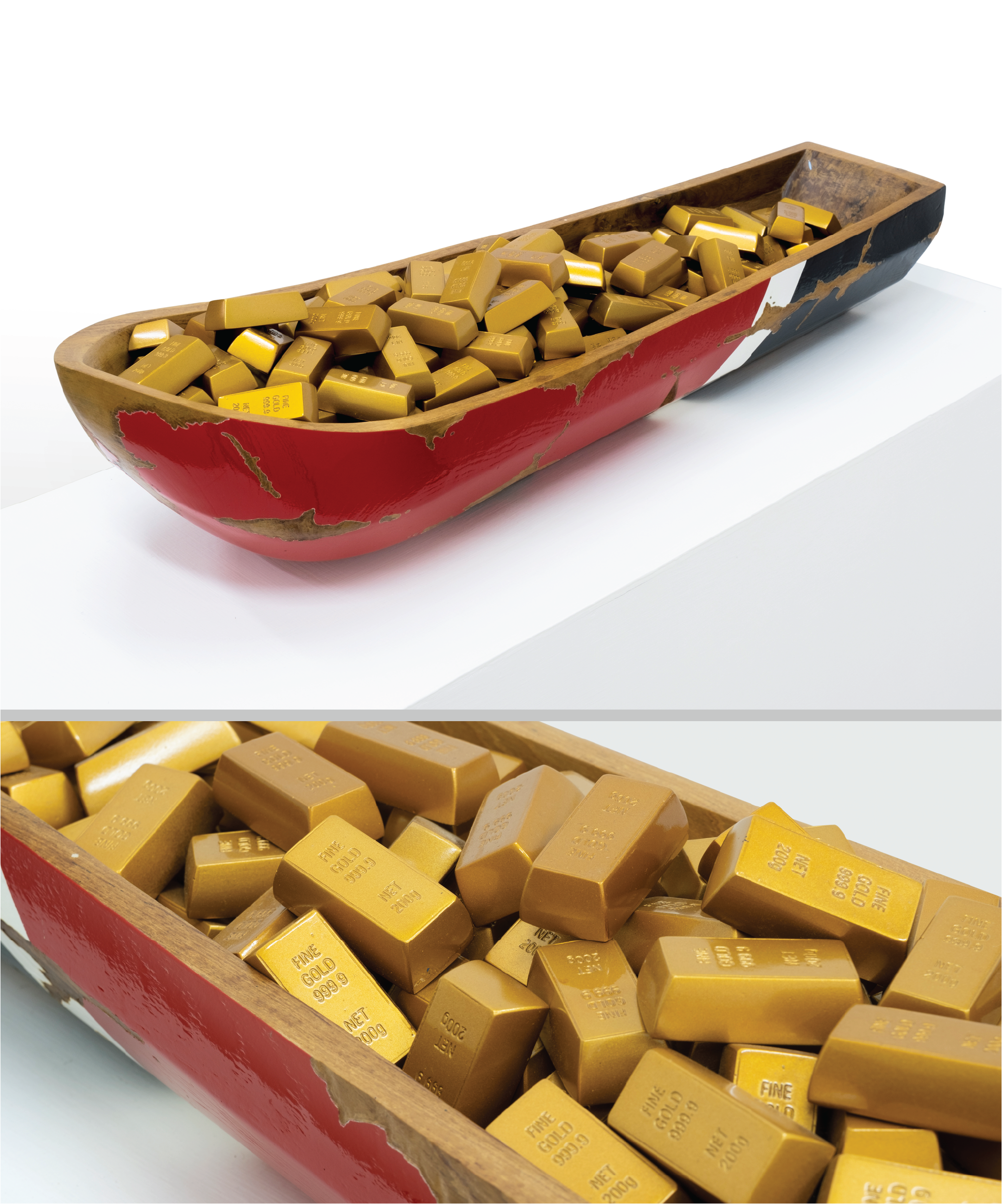 The irony accompanying this progress is that science is always a double-edged sword. It is not merely a tool for uncovering truth but part of the machinery of power— aligned with capitalism, imperialism, or specific ideologies. The scientific knowledge we acquire, rather than guiding us to enlightenment, is often directed towards exploitation, domination, and the accumulation of capital for maximum profit. In works like Gemah Ripah Loh Jinawi and Generasi Emas (Golden Generation), this critique is palpable. Through his plain fabric dolls, Samsul captures the absurdity of the promises of welfare offered by capitalist forces. Mendayung Mendulang (Paddling and Harvesting) for instance, depicts a simple doll rowing a boat filled with gold bars—a striking irony between innocence and greed. The boat seems to navigate a sea of illusions, a journey that appears to lead to prosperity, yet harbors uncertainty and ambiguity beneath the surface.
