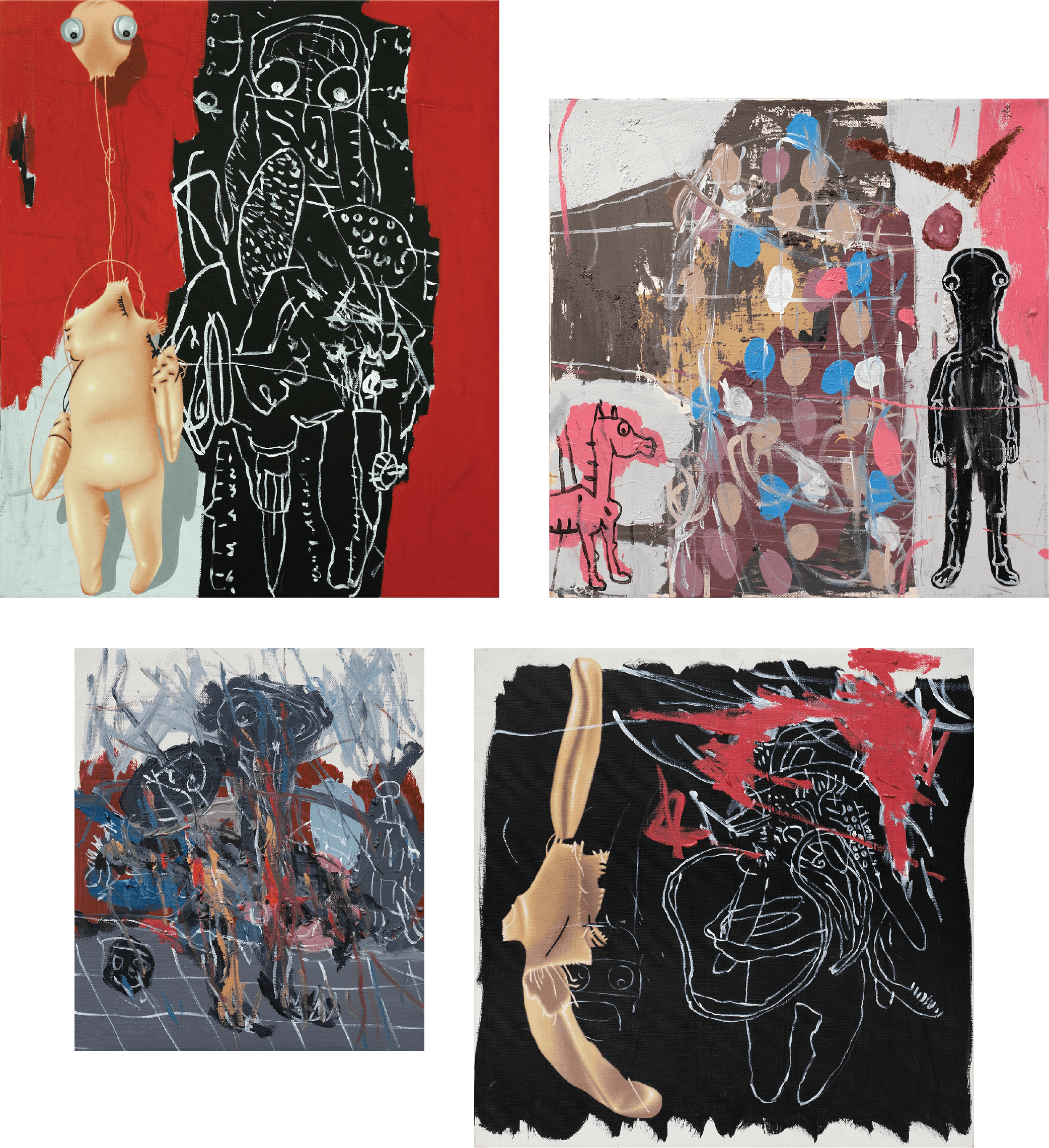One of the hallmarks of Samsul's paintings lies in his presentation of the tension between two expressive languages in art: the meticulous, detailed, and refined on one side, and the wild, unrestrained, and formless on the other. His burlap dolls, whether made of fabric or skin, often feature meticulous craftsmanship—each fold, wrinkle, and even tear that reveals the stuffing feels palpable. However, the backdrop of wild brushstrokes creates a striking contrast: a dissonance between the intact figure and the seemingly chaotic arrangement.