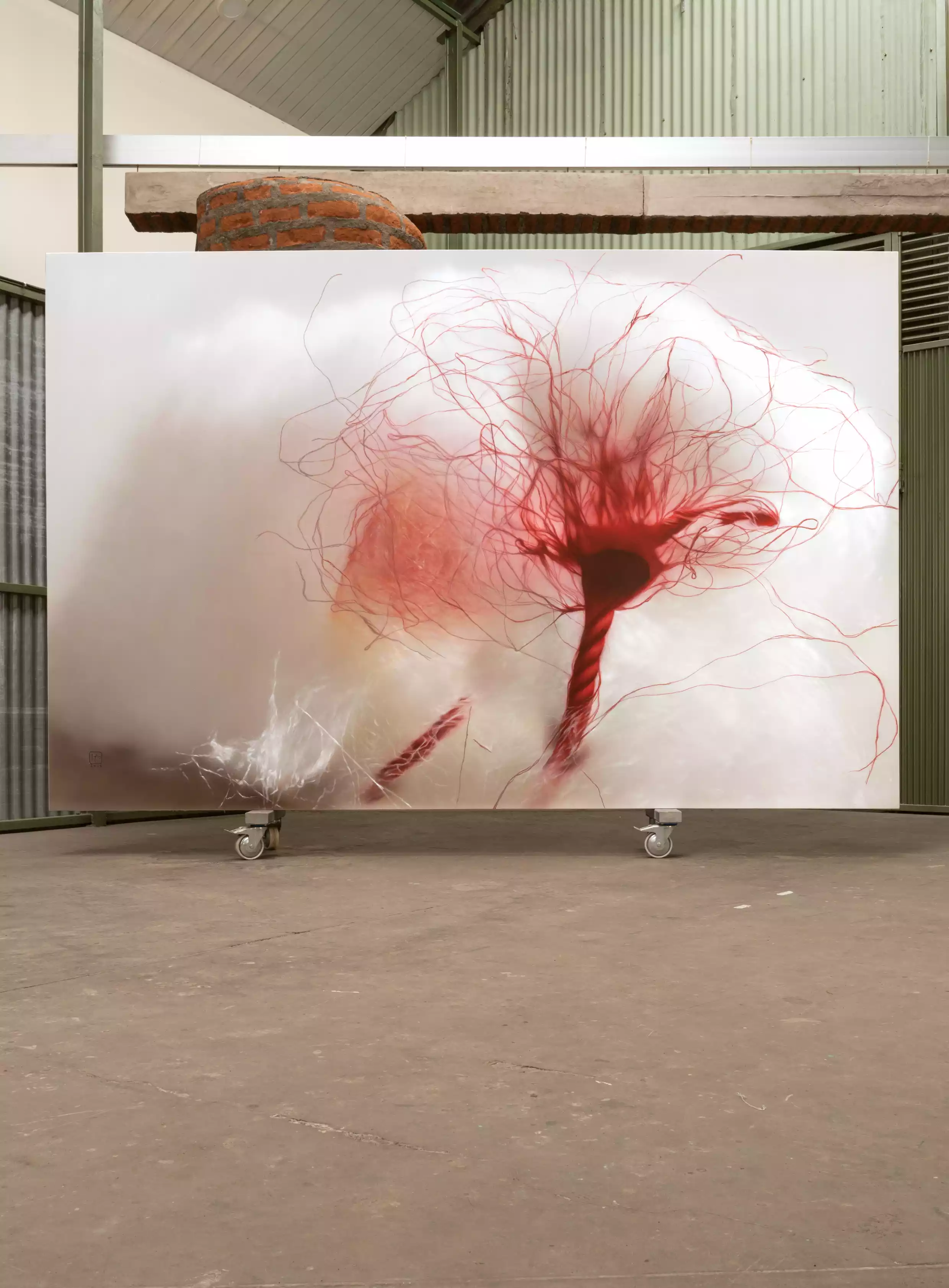 Painting on wall (sand powder, brick powder, styrofoam, waterproof, iron pipe)
