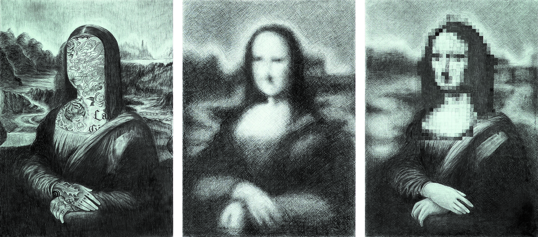 When we take a closer look at the relaxed pace of two of Abdi Setiawan's drawings using manufactured charcoal, bought from a stationery or painting shop, at this Mengarang exhibition: Monalisa (2022, charcoal on linen paper, 79.3 x 108.9 centimeter x 3) and The Immortal (2022, charcoal on linen paper, 79.3 x 108.9 centimeter x 3), it is difficult to ignore the impression that both are acknowledgement and tribute to the famed 12 million dolars installation art of the American Damien Hirst, The Physical Impossibility of Death in the Mind of Someone Living (1991, mix media), and the masterpiece work of Leonardo da Vinci, Mona Lisa (1503-1519, oil paint, panel, wood, poplar, 77 x 53 centimeter. In 2010, as he told me, Abdi Setiawan once saw the Mona Lisa at the Louvre Paris with his own eyes, albeit from the 3-4 meter distance that made it hard to observe the details in the painting, since there were so many people queueing in front of it. This anecdote forced me to acknowledhe the statement made by Walter Isaacson, the author of Leonardo da Vinci latest biography regarding the Mona Lisa: “What began as a portrait of a silk merchant’s young wife became a quest to portray the complexities of human emotion, made memorable through the mysteries of a hinted smile, and to connect our nature to that of our universe.” Therefore, Abdi Setiawan’s Monalisa can very much be perceived as a reflection of his experience seeing Leonardo da Vinci’s Mona Lisa with three different ways of perceiving.